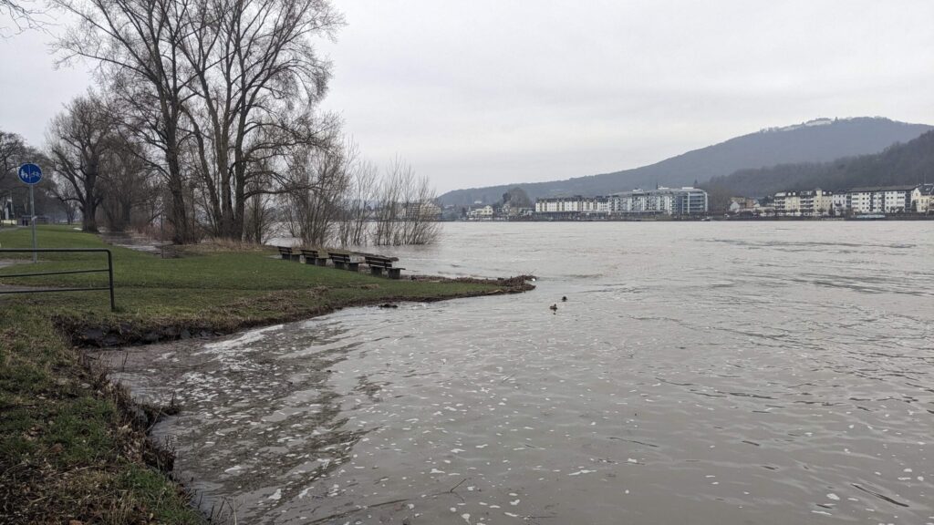 Dieser Wasserstand am Mehlemer Ufer an der ehemaligen Schiffsbeladestelle „Vygens Werft“ etwa Höhe Gernotstraße entspricht einem Pegelstand von 5,15 m in Oberwinter.